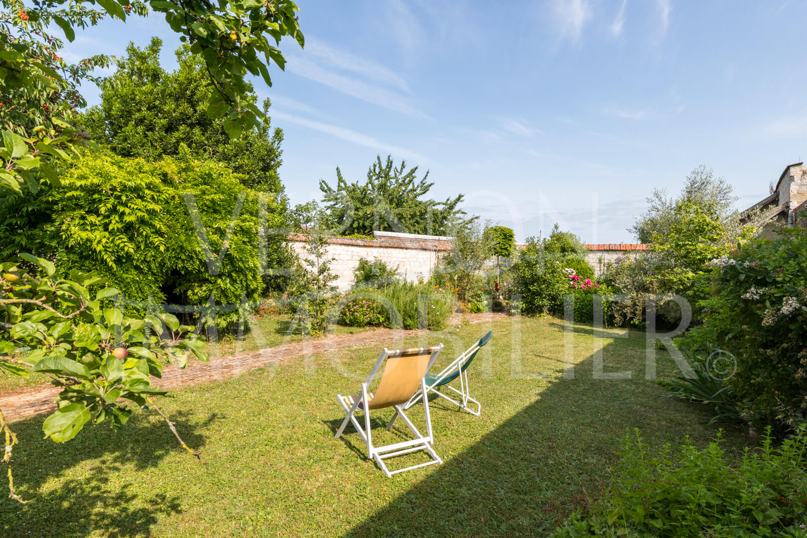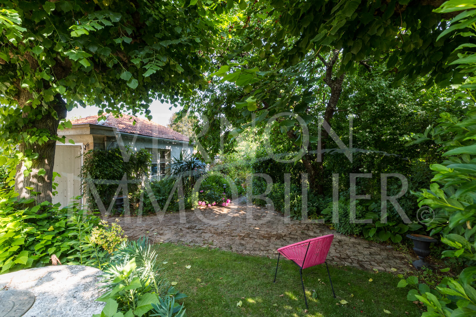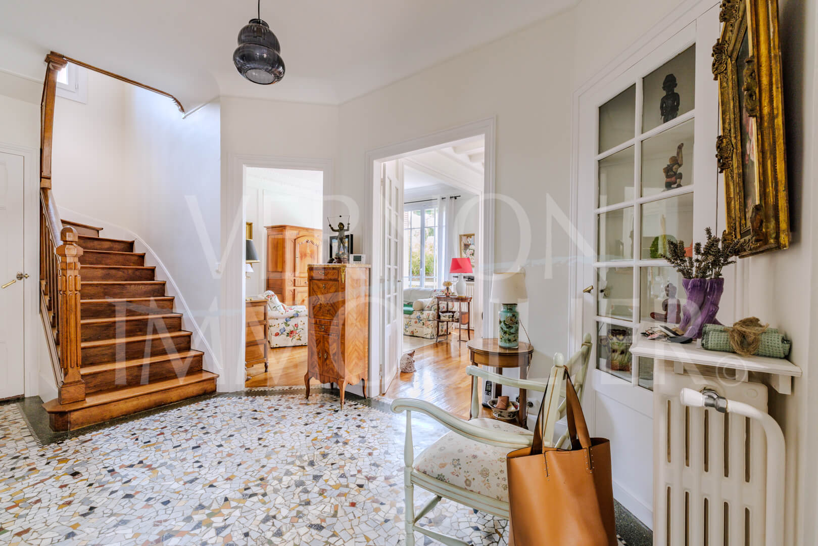 Entièrement rénovée en 2023 en respectant les matériaux d’origine, elle comprend au rez-de-chaussée une vaste entrée distribuant une cuisine aménagée et équipée avec un accès direct sur le jardin, une pièce de vie double avec cheminée en marbre, moulures et parquet, un second salon ou une chambre avec sa salle d’eau attenante et un cabinet de toilette avec wc.