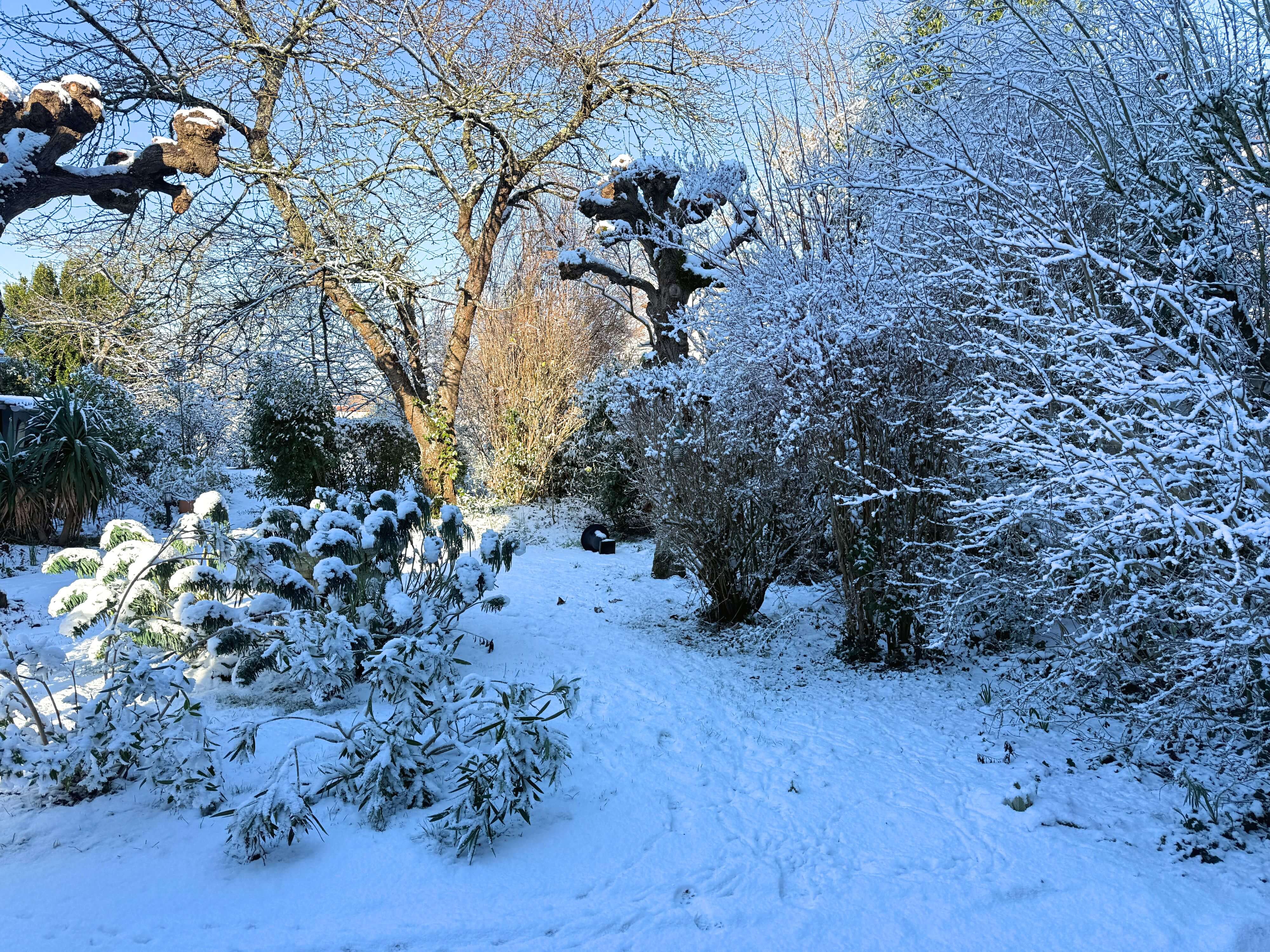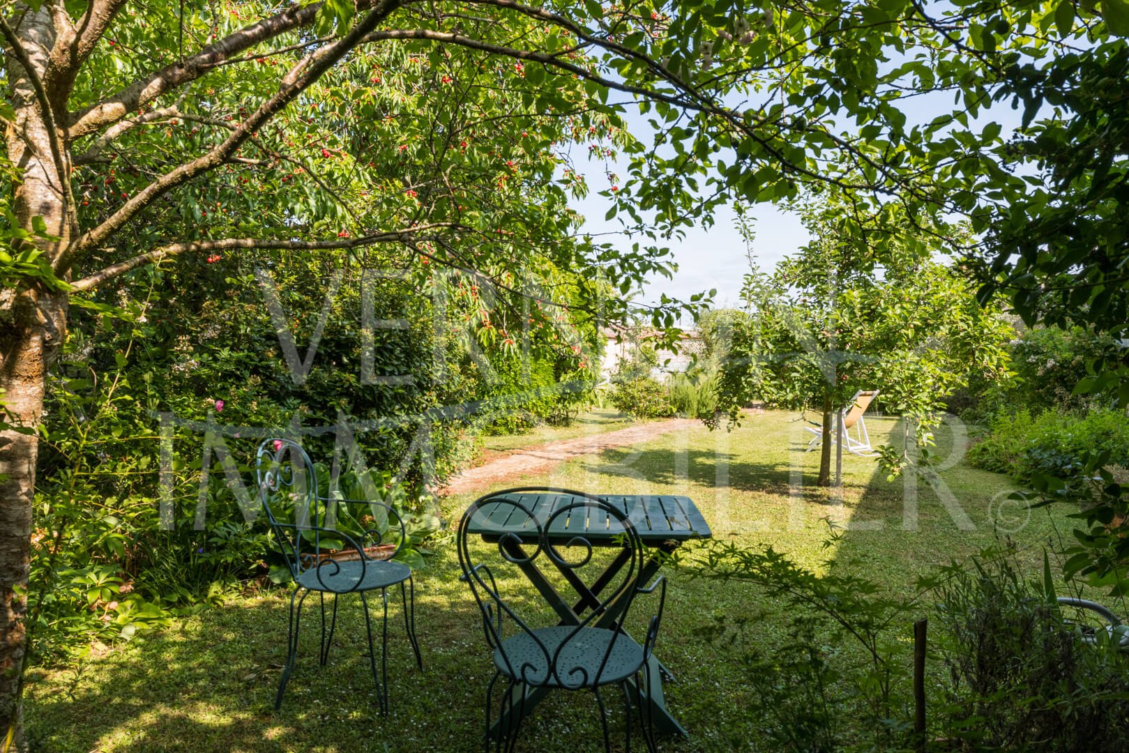 Beau jardin très joliment arboré et clos, avec garage et abris de jardin.