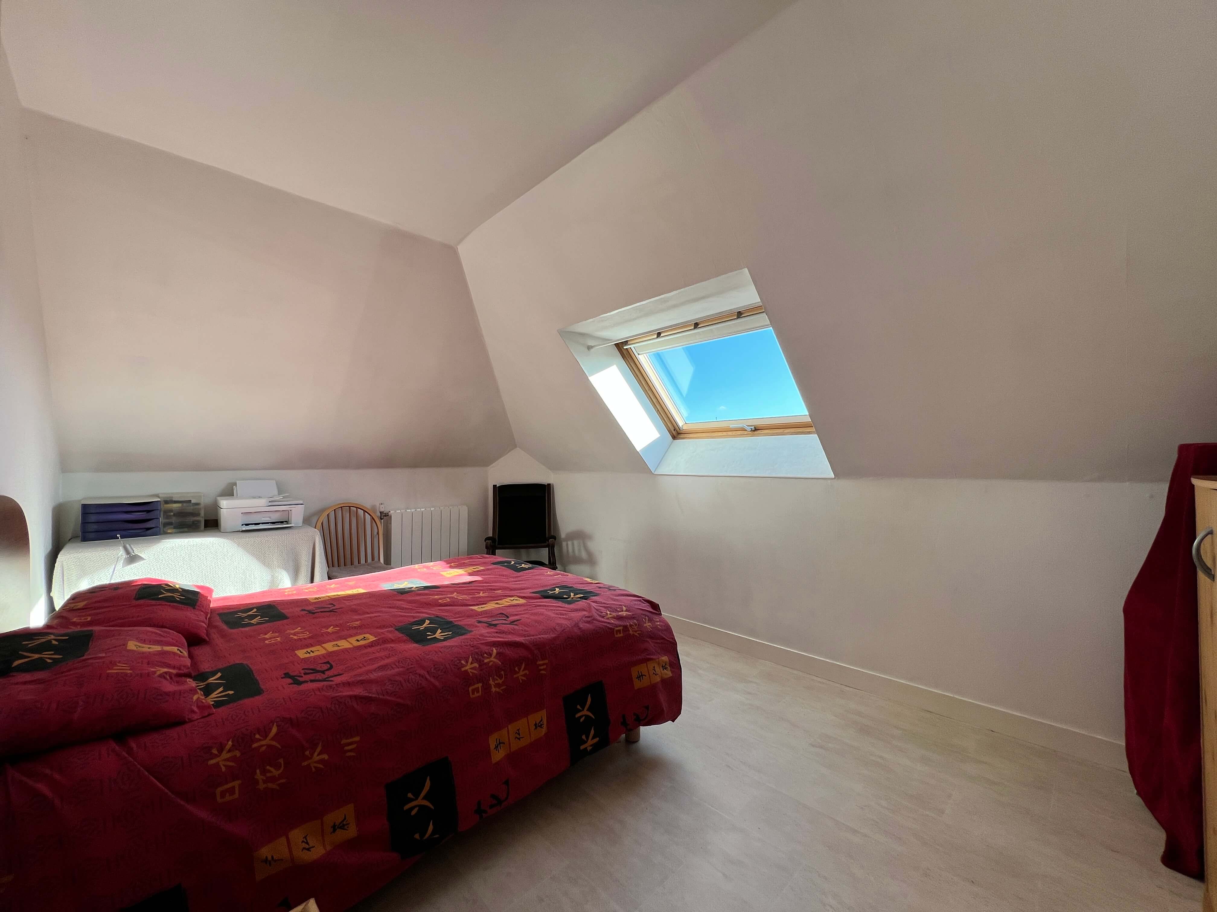 Il comprend une entrée avec rangements, un salon/séjour avec beau parquet, belle cuisine aménagée et équipée, dégagement, deux grandes chambres, salle d’eau, w-c.