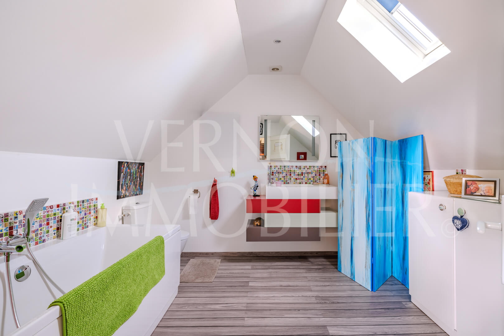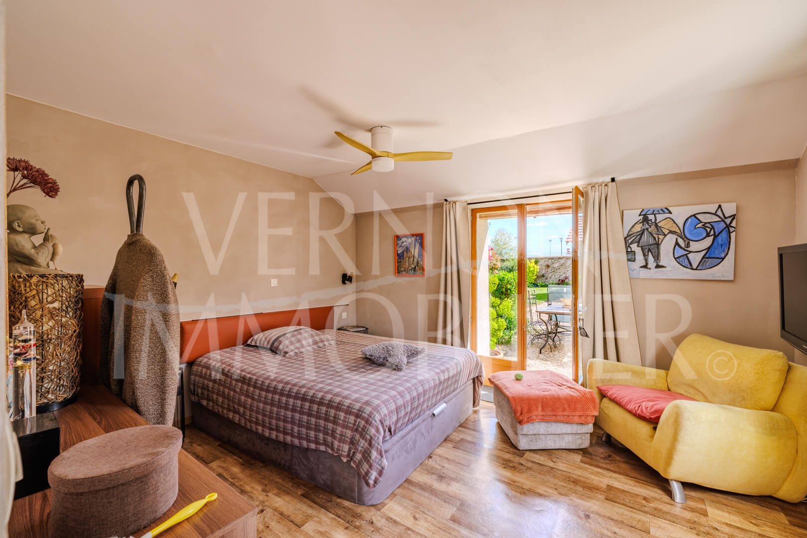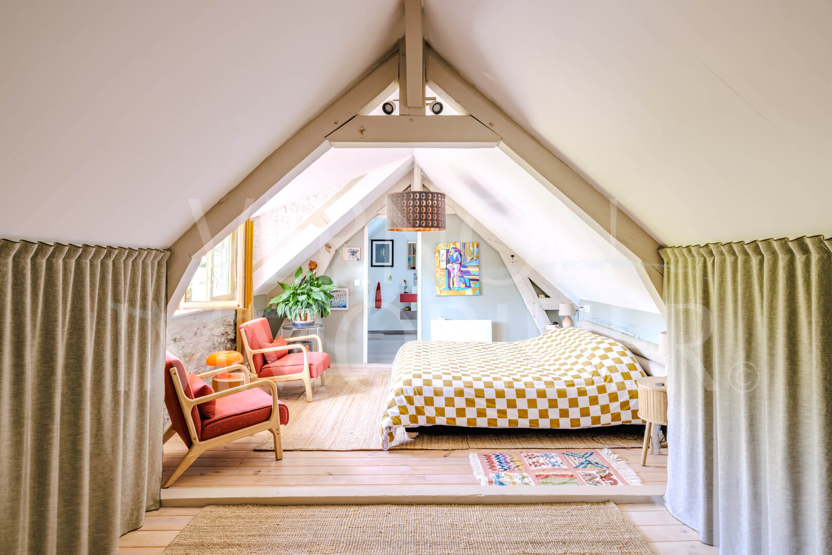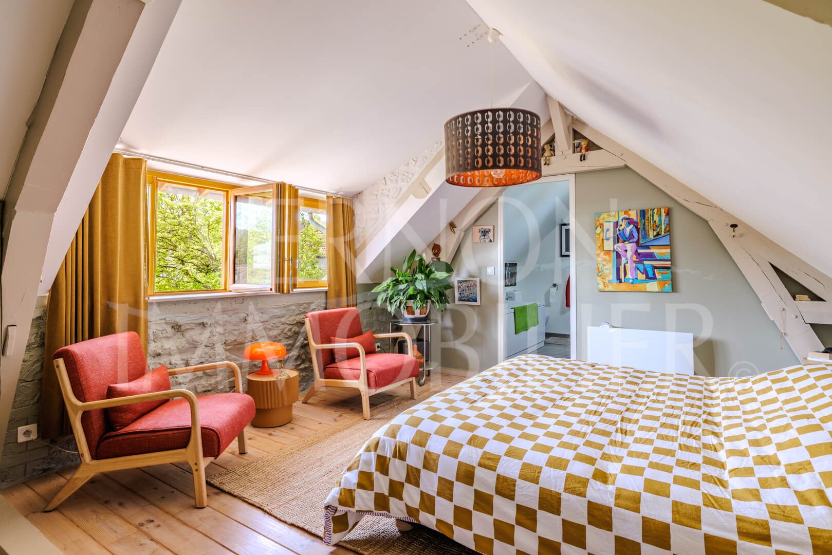 A l’étage, un palier/bureau, une grande chambre et une salle de bains privative avec wc.