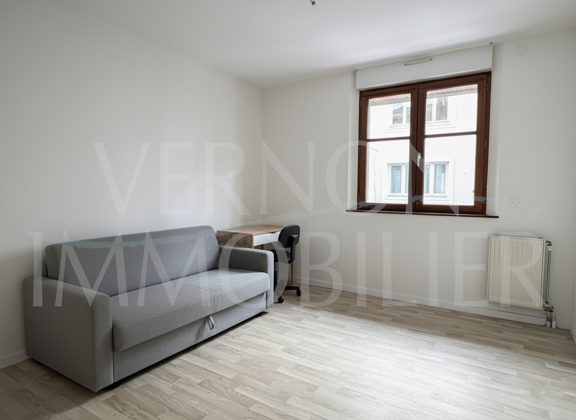 Dans une résidence au centre de Vernon, avec ascenseur, appartement de type F1en très bon état comprenant une entrée avec placards, un salon/chambre, une cuisine aménagée, une salle d'eau avec wc.