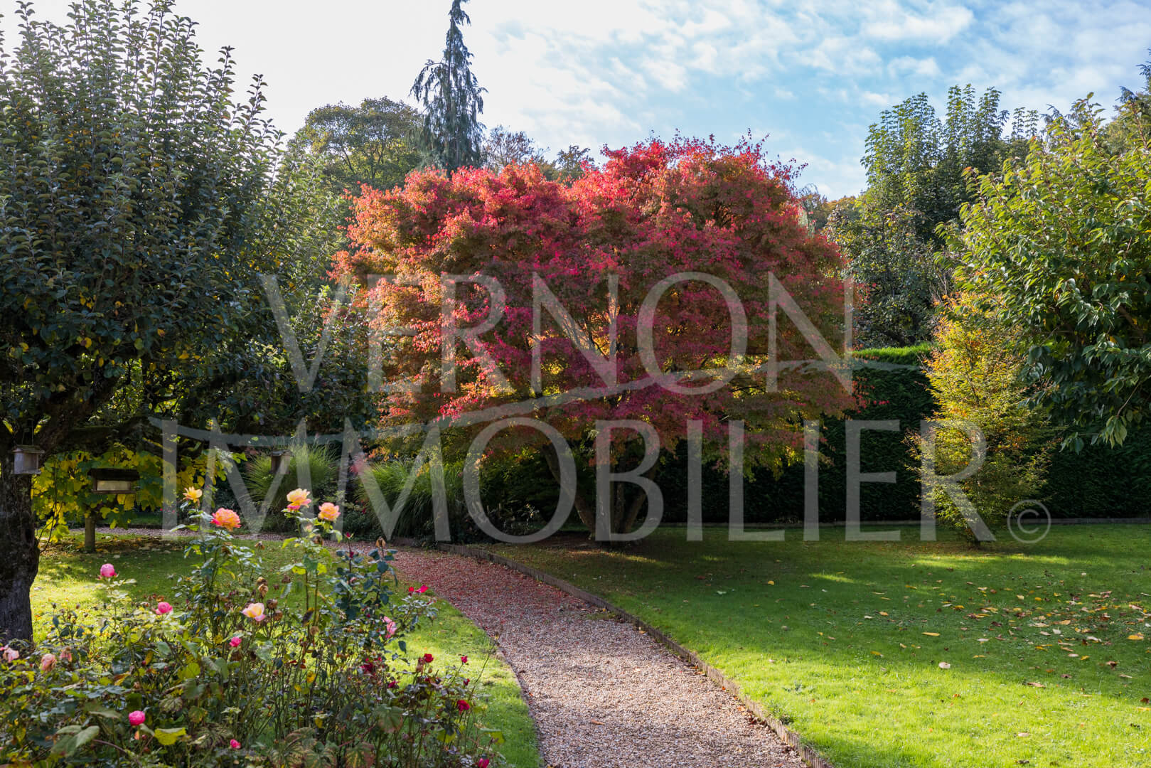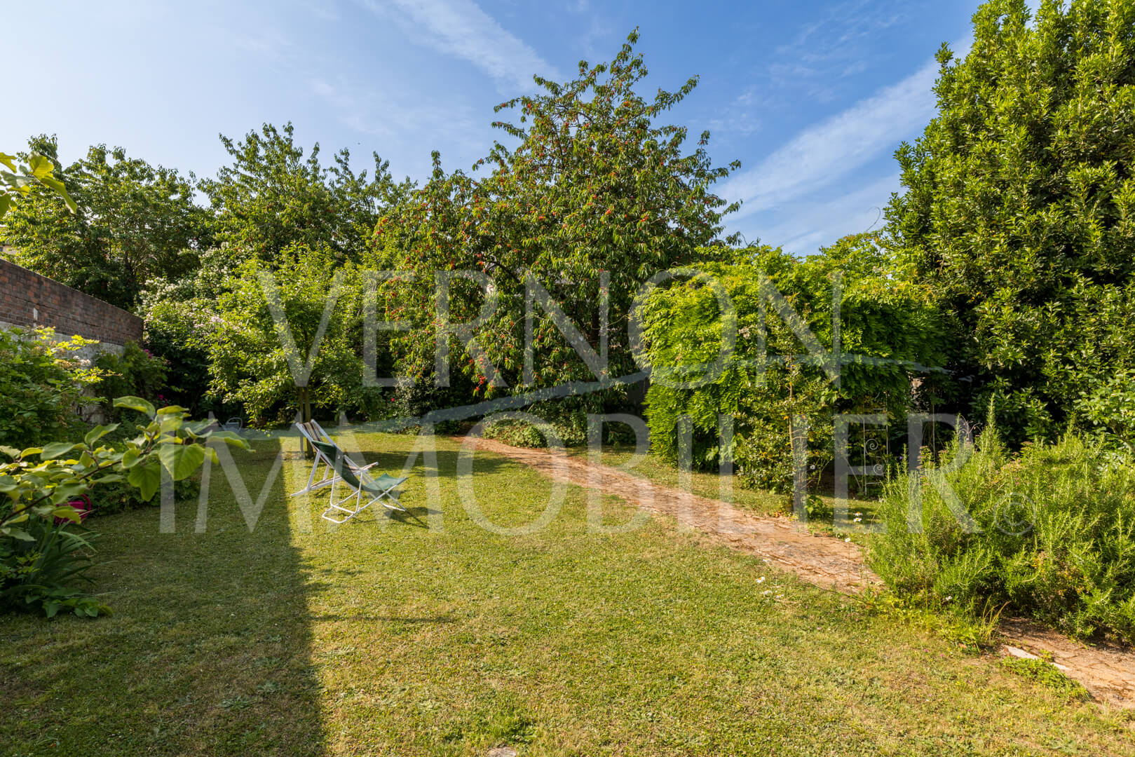 Beau jardin arboré et clos de murs.