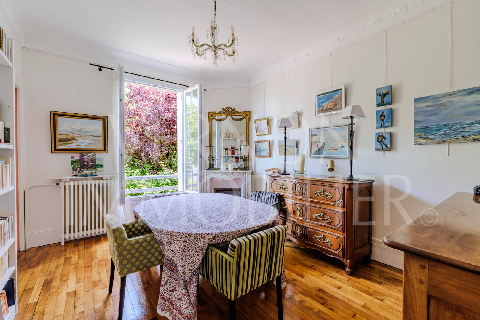 Au rez-de-chaussée, un magnifique salon de 43 m² avec belles boiseries anciennes et cheminée, salle de réception, petit salon et grande cuisine aménagée.